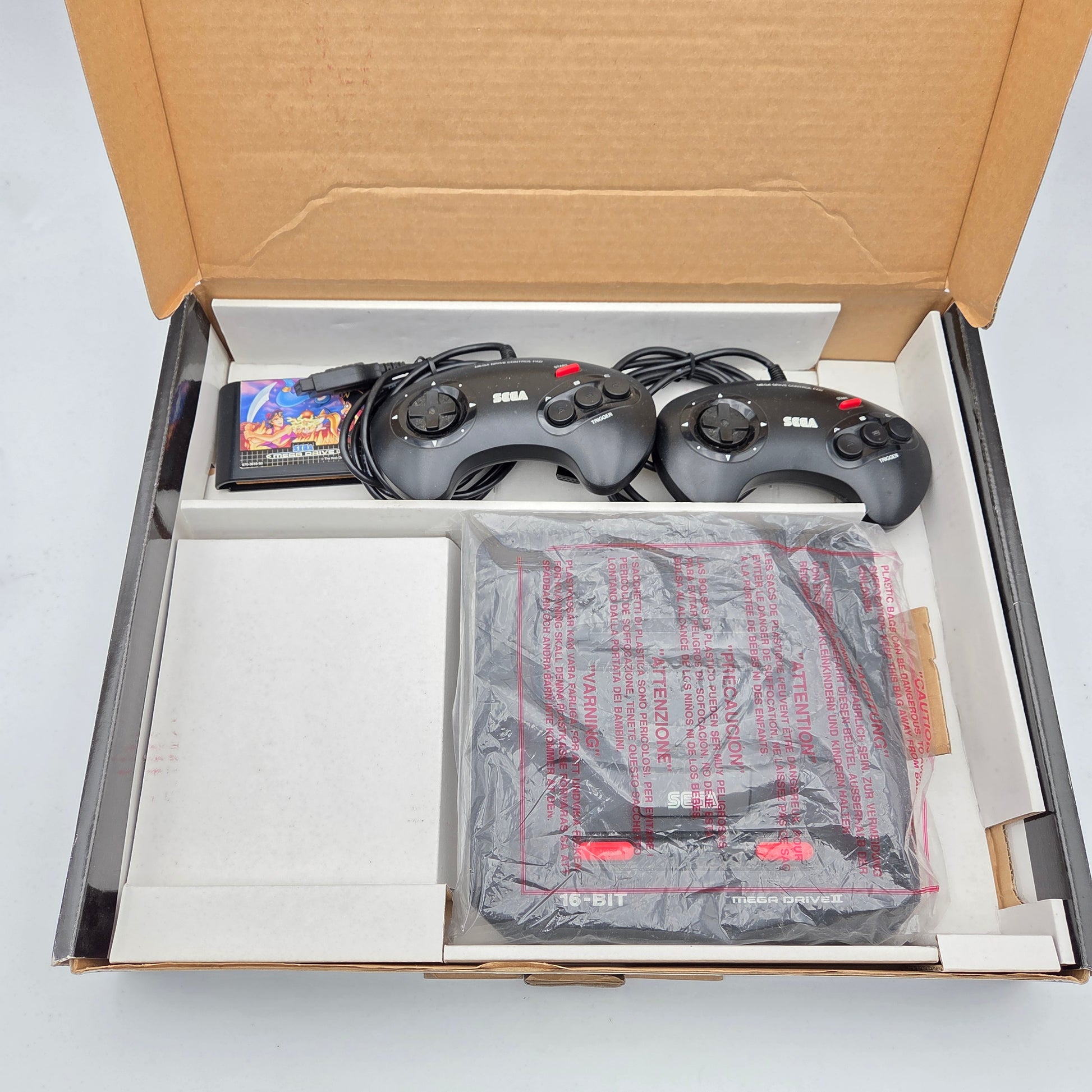 La Mega Drive 2 Pak Aladdin est un bundle de jeu classique qui réunit la console 16-bit emblématique de Sega avec l'un des jeux de plateforme Disney les plus appréciés. Ce pack complet inclut le système Mega Drive 2 et une cartouche d'Aladdin, offrant des graphismes vibrants, des commandes réactives et un gameplay stimulant qui a marqué l'époque. Parfait pour les passionnés de jeux rétro et les collectionneurs en quête d'un divertissement authentique des années 90. Découvrez la magie d'Agrabah avec cette combinaison intemporelle de matériel et de logiciel.